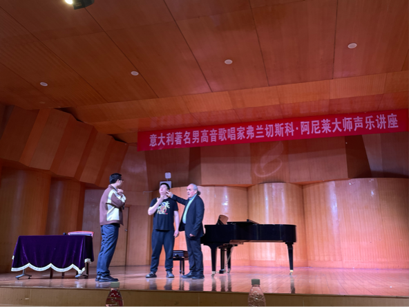 4月18日,意大利著名男高音歌唱家弗蘭切斯科·阿尼萊大師聲樂講座在我院小音樂廳成功舉辦。講座由聲樂系系主任陳世揚副教授主持。
