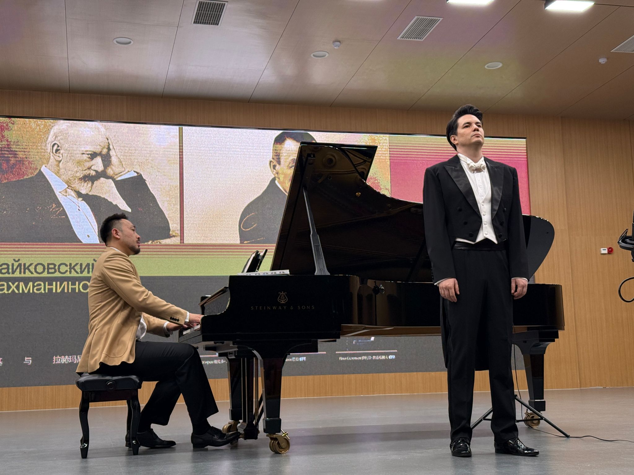 5月15日的德樂樓大音樂廳內(nèi),鋼琴教師巴日與兩位外教聯(lián)袂呈現(xiàn)“獻(xiàn)給柴可夫斯基與拉赫瑪尼諾夫”專題音樂會。維克多·薩基洛夫以《在喧鬧的舞會上》《如往日般孤獨》等曲目,詮釋了俄式聲樂的深沉與憂郁;巴日與伊利亞·索洛維耶夫則通過《沉思》《夜曲》等獨奏作品,展現(xiàn)了柴可夫斯基和拉赫瑪尼諾夫鋼琴音樂的戲劇性與詩意。