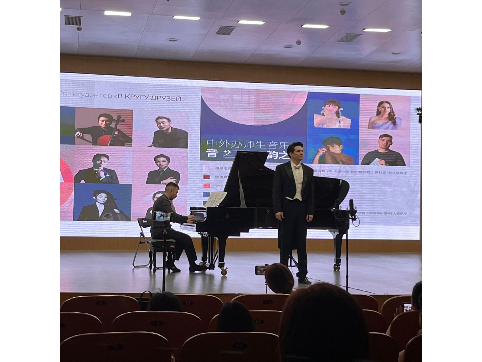 5月20日,中外班師生音樂會——音韻之旅在德樂樓大音樂廳舉行。演出節(jié)目豐富多樣,皮亞佐拉《冬季》由鋼琴、大提琴、小提琴三種樂器三重奏演繹,維克多?薩吉羅夫演唱的《如蘋果般紅潤》和《羅德里戈詠嘆調(diào)》,以及葉卡捷琳娜?圖爾納耶娃演唱的《說吧,在枝葉的陰影中》和《此處美好》等,都展現(xiàn)了極高的演唱水準(zhǔn)。中國作品《憶秦娥·恒山月》則通過聲樂與鋼琴的配合,傳遞了古典詩詞的意境。壓軸曲目《亞美尼亞狂想曲》以雙鋼琴的澎湃張力,為當(dāng)晚音樂會畫上輝煌句點。