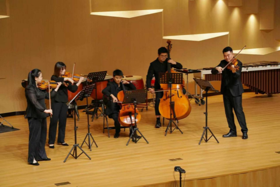 隨想弦樂五重奏與隨想重奏組接連登場,隨想弦樂五重奏首先為大家呈現(xiàn)的蒙蒂的經(jīng)典作品——《查爾達什舞曲》。各聲部情感充沛,技巧嫻熟,引領學生們感受了從深沉到狂歡的情緒起伏。隨后,隨想重奏組帶來皮亞佐拉的名作《賦格》。這部作品加入了打擊樂,巧妙地把古典賦格的嚴謹與探戈的熱情相融合,將古典賦格的嚴謹與探戈的熱情巧妙融合,帶來別具一格的聽覺體驗。