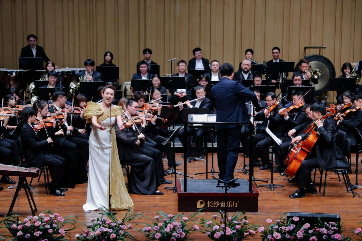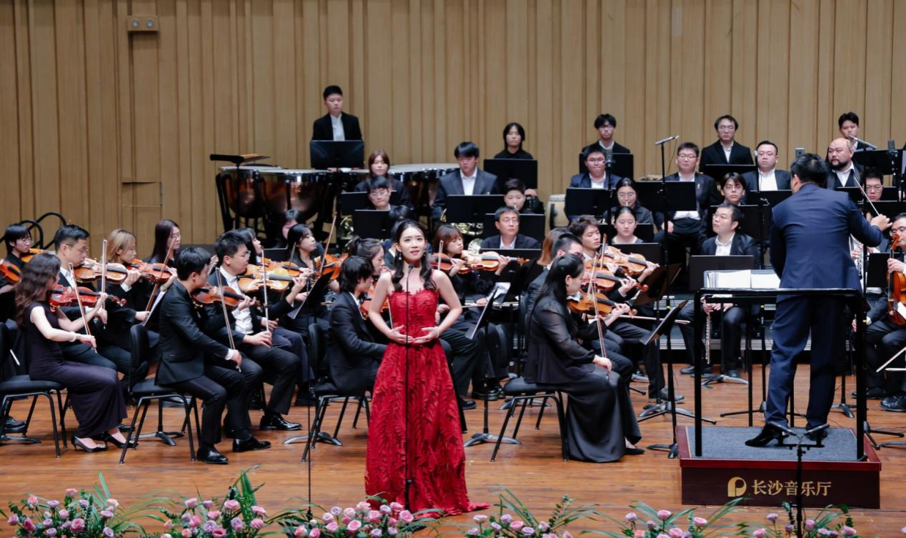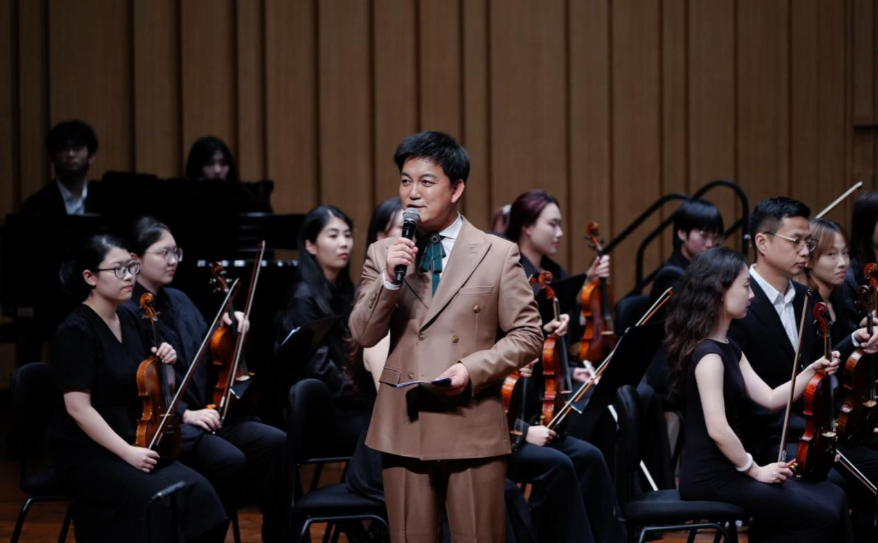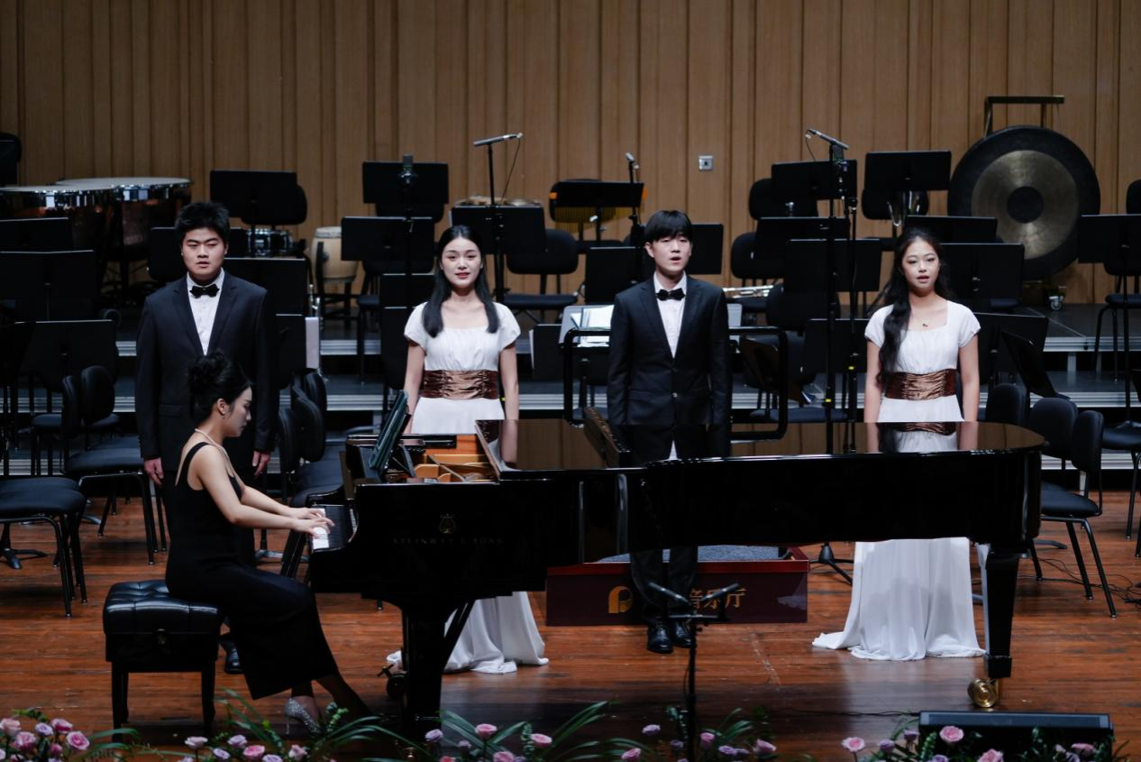 音樂會在瀟湘愛樂交響樂團(tuán)充滿濃郁湖南味道的管弦樂《花鼓抒懷》中拉開帷幕。作品由音樂學(xué)院院長廖勇教授創(chuàng)作,將湖南花鼓戲的靈魂旋律和獨(dú)特元素融入交響語境,彰顯了厚重的地域文化底蘊(yùn)。隨后,青年教師王藝璇、博士生曲丹分別演唱了《岳麓書院》《高山流水》,顯示出金鐘獎實(shí)力的完美唱功。青年教師王文潔、陳薪竹、彭帥理、陳浩然合作的器樂合奏《Tico Tico》節(jié)奏明快,嗨翻全場。青年教師劉文婷與黃敏佳的二重唱《親愛的祖國》、李卓軒與博士生姚嵐演繹的莫扎特歌劇選段《讓我們攜手同行》,分別以家國情懷與古典歌劇魅力打動觀眾。青年教師周末表演的鋼琴協(xié)奏曲《保衛(wèi)黃河》激昂慷慨,奏響民族精神強(qiáng)音,傳達(dá)出音樂巨大的號召力量。