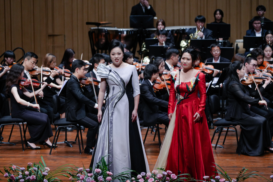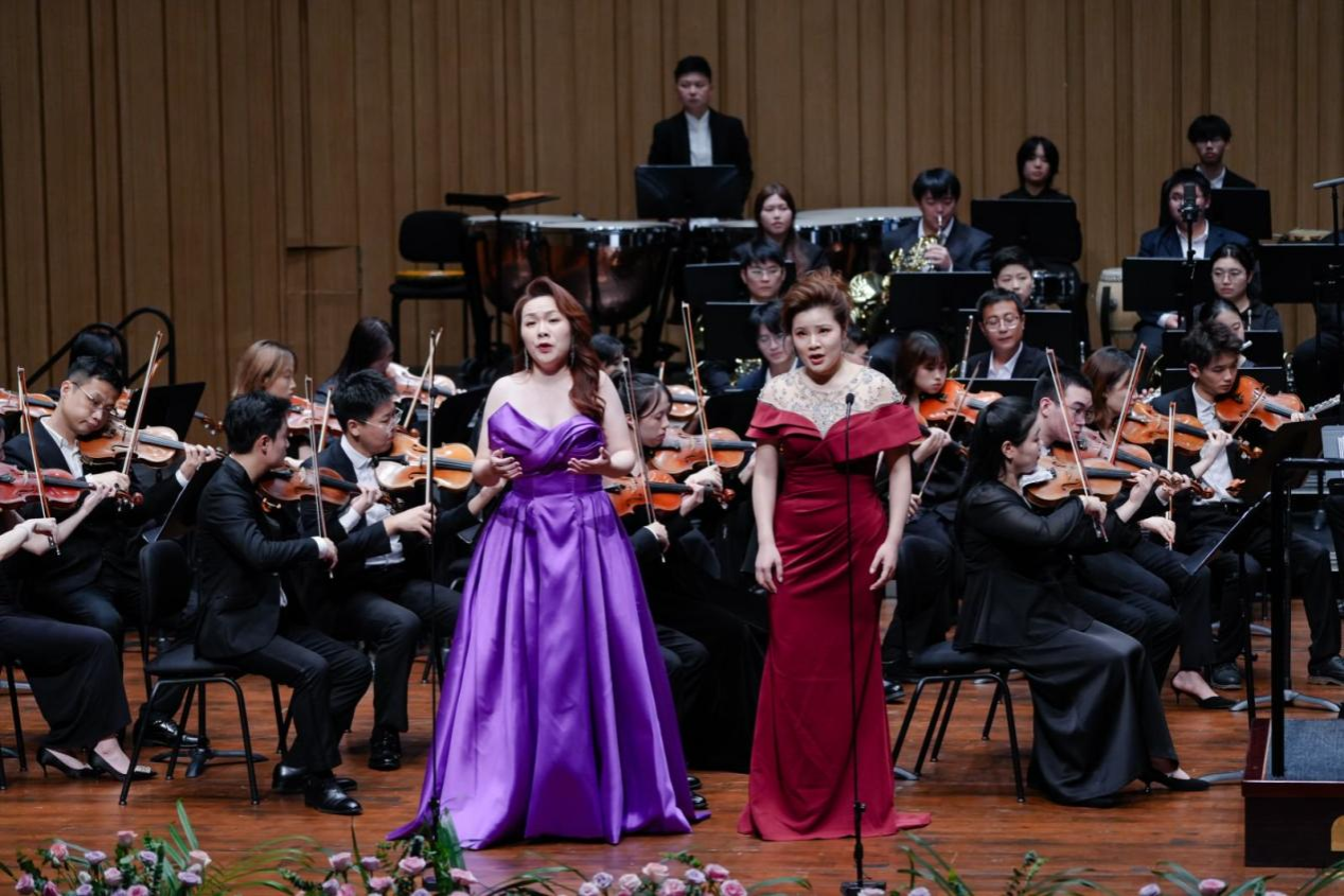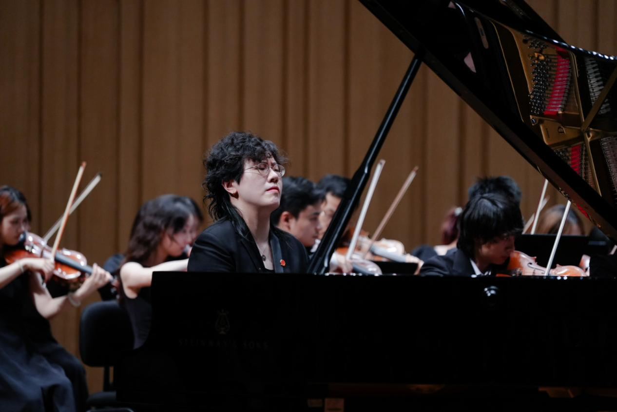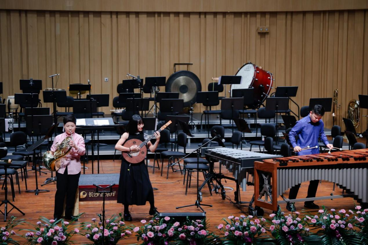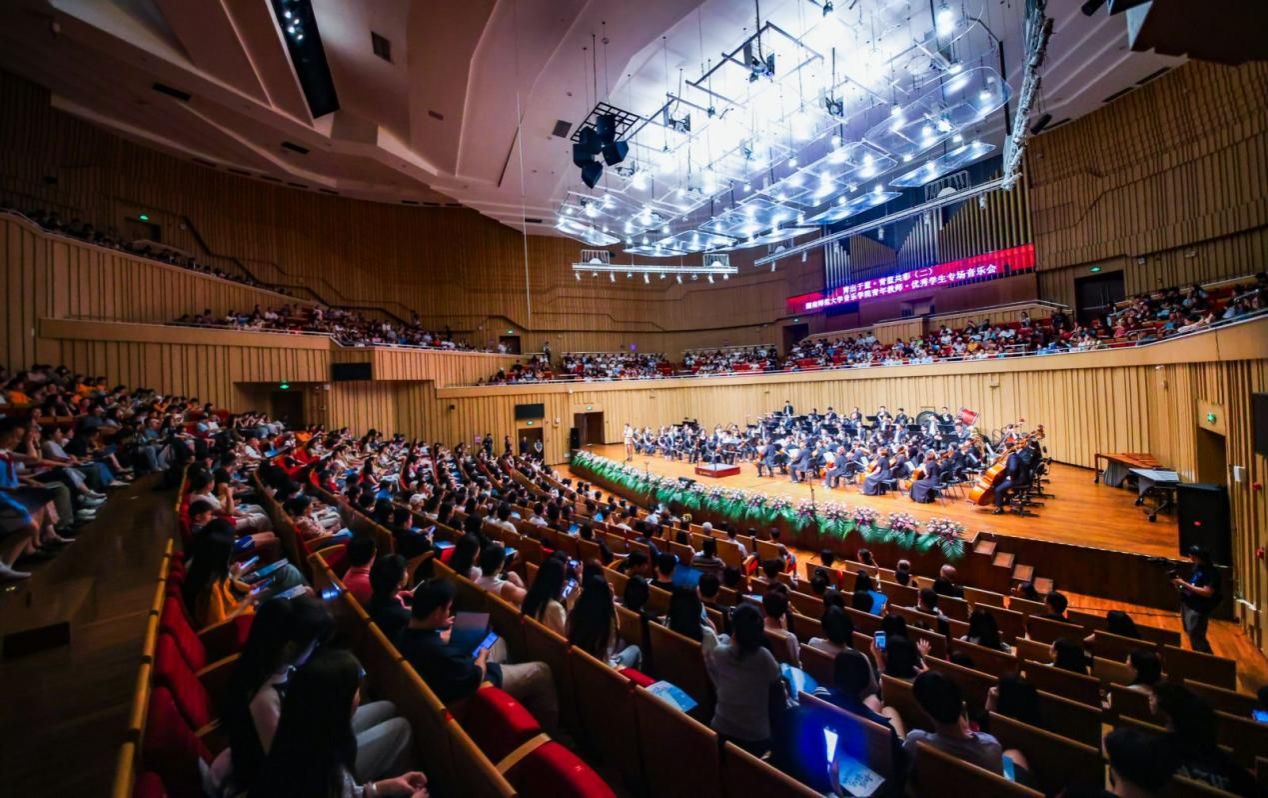音樂會在瀟湘愛樂交響樂團(tuán)充滿濃郁湖南味道的管弦樂《花鼓抒懷》中拉開帷幕。作品由音樂學(xué)院院長廖勇教授創(chuàng)作,將湖南花鼓戲的靈魂旋律和獨(dú)特元素融入交響語境,彰顯了厚重的地域文化底蘊(yùn)。隨后,青年教師王藝璇、博士生曲丹分別演唱了《岳麓書院》《高山流水》,顯示出金鐘獎實(shí)力的完美唱功。青年教師王文潔、陳薪竹、彭帥理、陳浩然合作的器樂合奏《Tico Tico》節(jié)奏明快,嗨翻全場。青年教師劉文婷與黃敏佳的二重唱《親愛的祖國》、李卓軒與博士生姚嵐演繹的莫扎特歌劇選段《讓我們攜手同行》,分別以家國情懷與古典歌劇魅力打動觀眾。青年教師周末表演的鋼琴協(xié)奏曲《保衛(wèi)黃河》激昂慷慨,奏響民族精神強(qiáng)音,傳達(dá)出音樂巨大的號召力量。