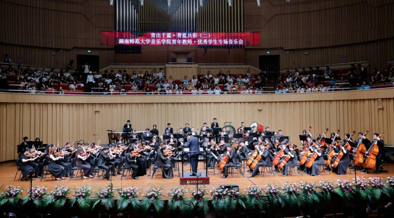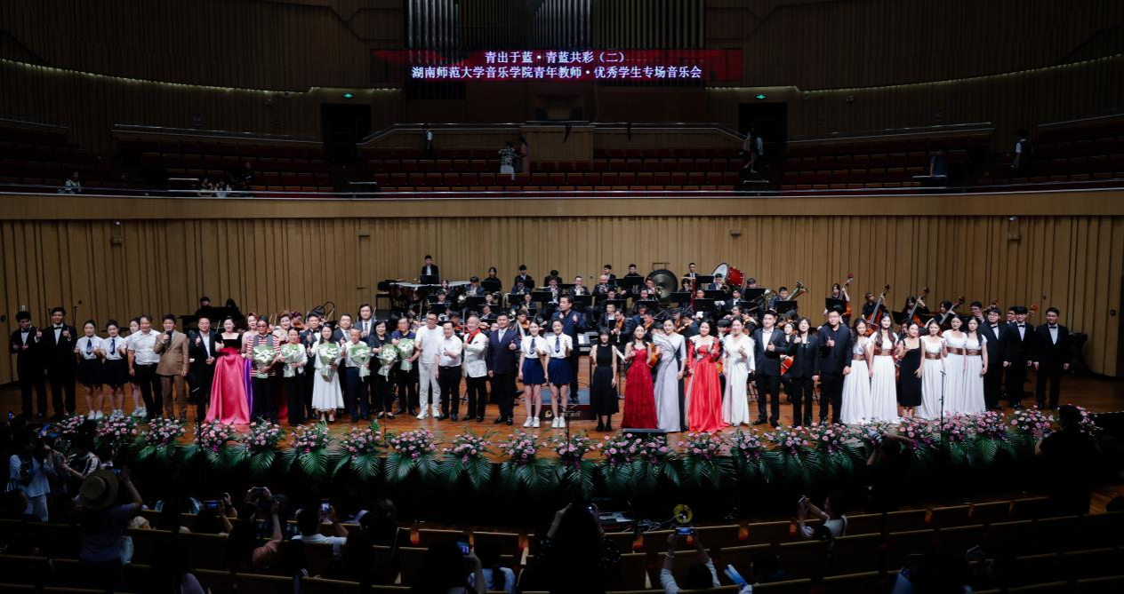 音樂會在歡樂而熱烈的氣氛中圓滿落幕,青藍(lán)故事卻依然延續(xù)。正如主持人李銳所說,“青藍(lán)共彩”是本場音樂會的主題,更是湖南師范大學(xué)70余年教書育人理念的生動表達(dá),也是湖南師大音樂學(xué)院始終秉持的人才培養(yǎng)理念。自1942年創(chuàng)辦音樂學(xué)專業(yè)起,學(xué)院始終堅(jiān)守“立德樹人”根本任務(wù),構(gòu)建起“學(xué)、練、創(chuàng)、演、賽”一體化實(shí)踐育人體系,從這里走出了李谷一、王佑貴、陳思思等知名藝術(shù)家,更向省內(nèi)外輸送數(shù)以萬計(jì)優(yōu)秀音樂教育人才,成為推動我國音樂教育事業(yè)發(fā)展的重要力量。本場音樂會主題中,“青”代表在教師指引下嶄露頭角的優(yōu)秀學(xué)子,他們在課堂汲取知識養(yǎng)分,在實(shí)踐中錘煉專業(yè)技藝;“藍(lán)”象征深耕教壇、潛心育人的教師群體,他們以扎實(shí)專業(yè)積淀為學(xué)子引路,以滿腔育人熱忱為成長護(hù)航。師生攜手登臺,既是藝術(shù)技藝的代際傳承,更是教育精神的接力傳遞,讓“教學(xué)相長”的理念在教師節(jié)的特殊氛圍中落地生根,成為獻(xiàn)給教師群體的獨(dú)特禮贊。
