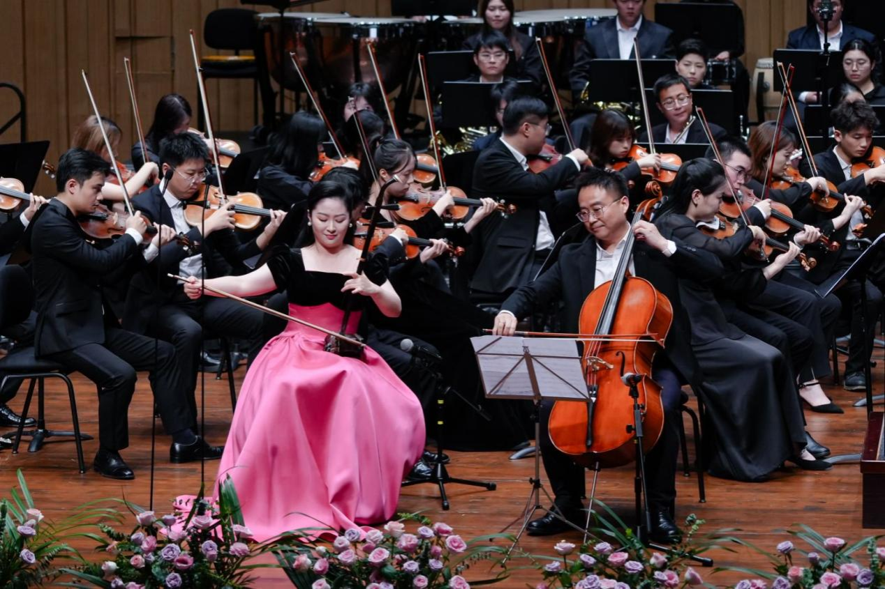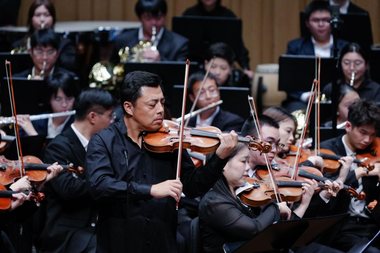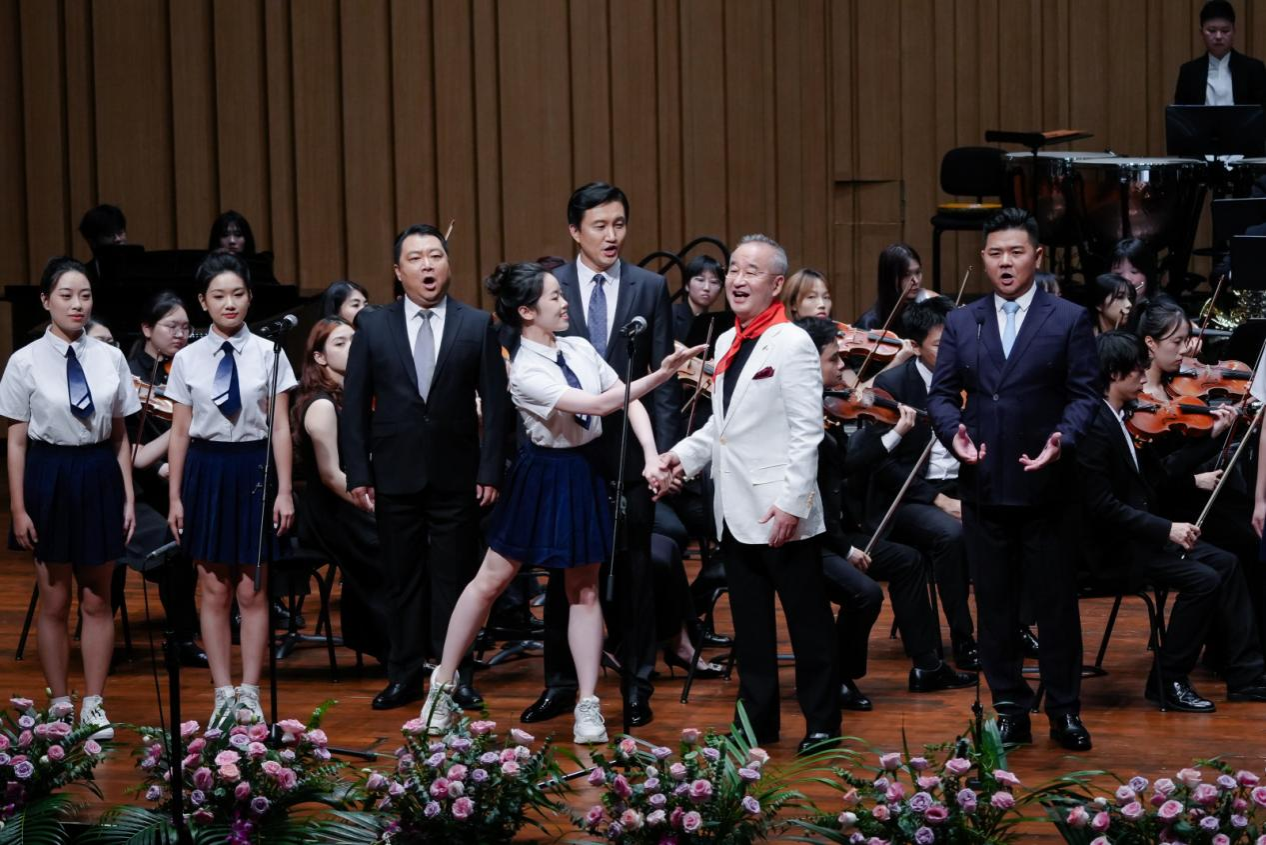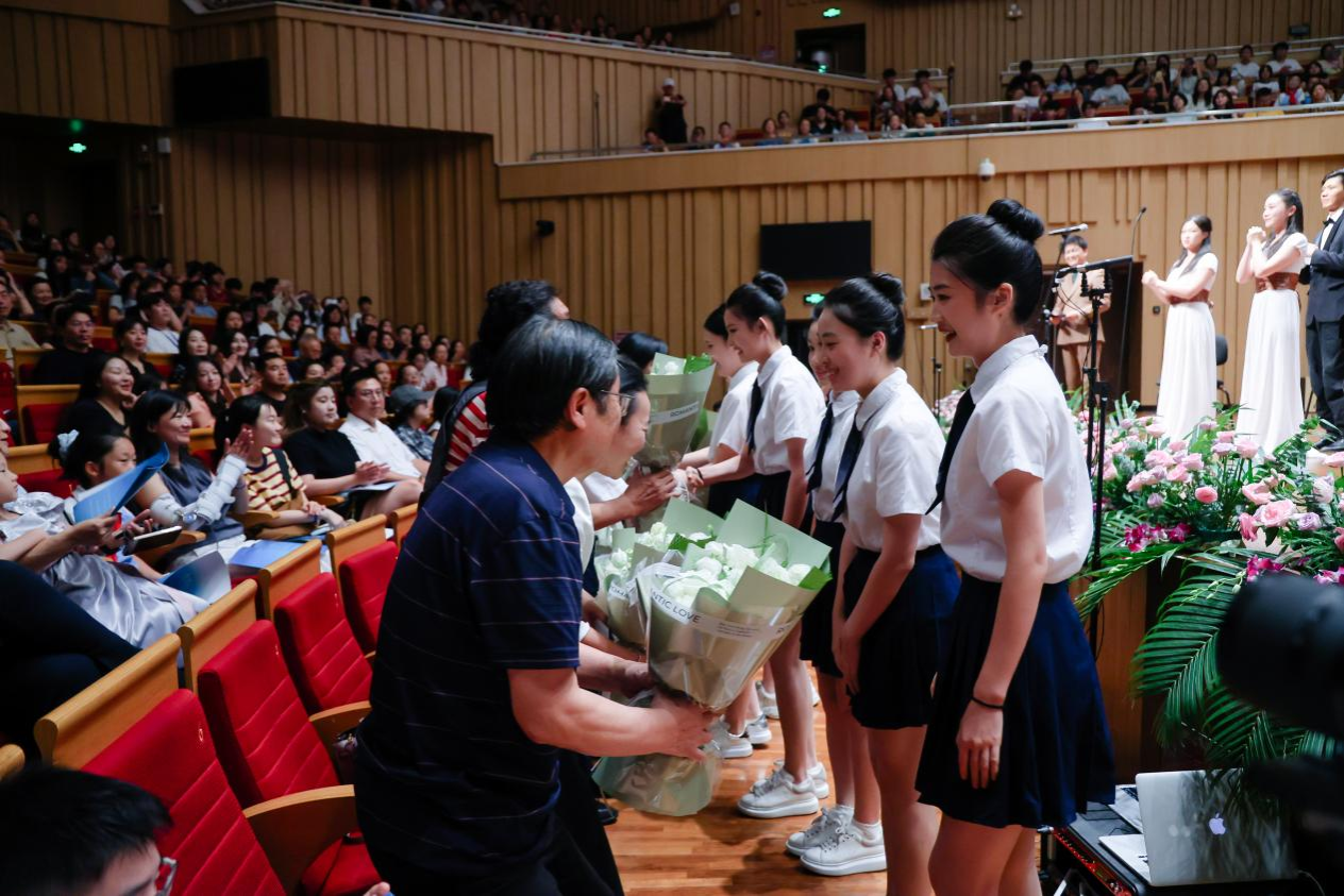 儀式之后,精彩繼續(xù)上演。廖勇創(chuàng)作的電影音樂組曲《影?響》展現(xiàn)了中西影視音樂創(chuàng)作的碰撞融合。著名小提琴演奏家、學(xué)院教授柴亮執(zhí)弓演繹學(xué)院名譽(yù)院長趙季平的《第一小提琴協(xié)奏曲》,以細(xì)膩琴音詮釋大師作品的深厚內(nèi)涵。青年教師錢樹林深情演繹《美麗時(shí)光》,充滿新疆音樂風(fēng)格的表演讓人耳目一新。青年教師夏攀與博士生導(dǎo)師陳果教授合作的二胡協(xié)奏曲《紅梅隨想曲》,讓民族樂器的悠揚(yáng)與大提琴的渾厚相得益彰。青年教師瞿鈺潔、謝韻蕾帶來的《花之二重唱》,盡顯西方歌劇的優(yōu)雅浪漫。壓軸曲目《長大后我就成了你》由虢建武、于洋、譚聞達(dá)、謝志懷等老中青三代教師與車心怡、何薇羽等學(xué)生共同演繹,師生巧妙改編歌詞,學(xué)生傾訴“長大后我想成為你”,老師贊譽(yù)“長大后你就成了我”,小小改動道盡師范教育的傳承初心,讓全場情感共鳴達(dá)到頂點(diǎn)。