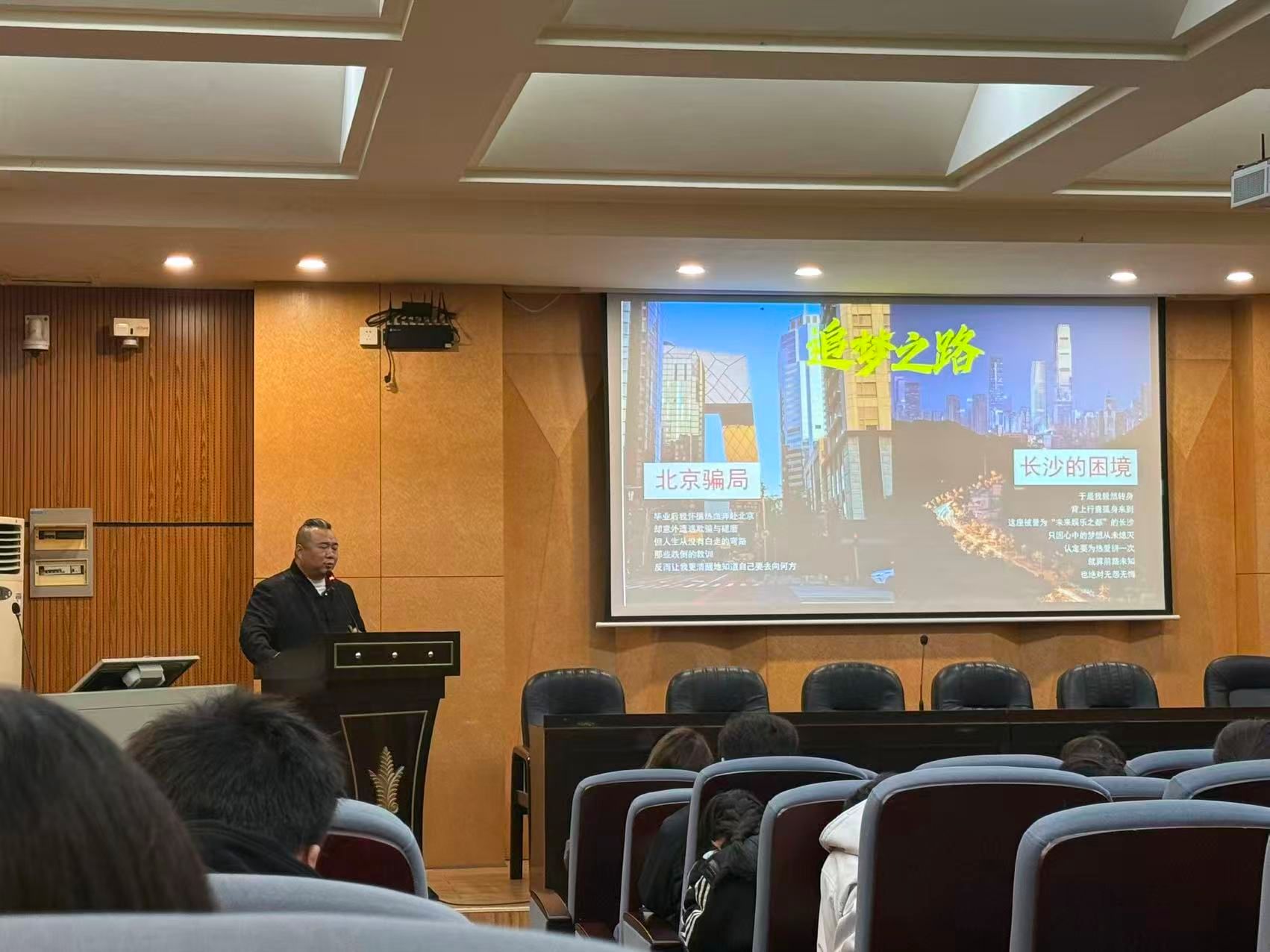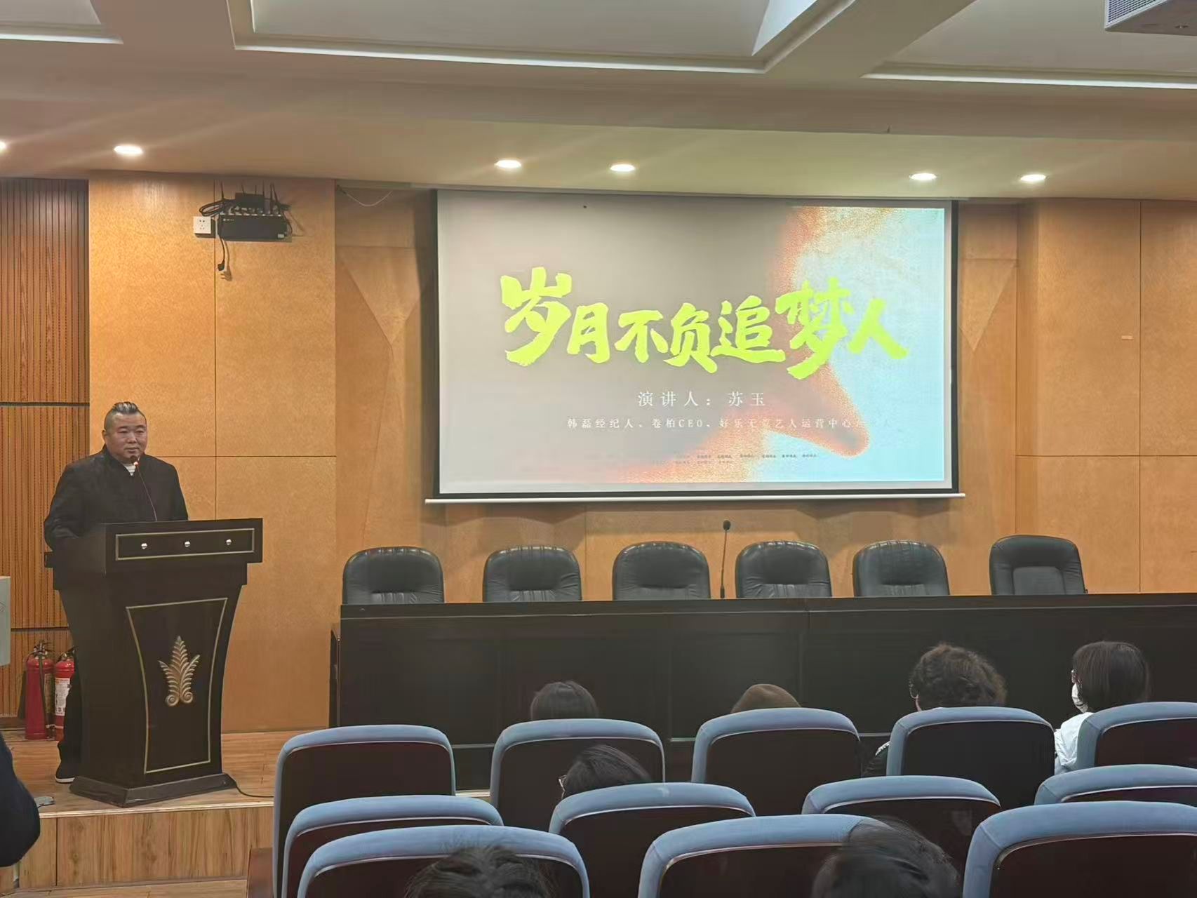 主講人蘇玉結(jié)合自身從農(nóng)村少年到行業(yè)知名經(jīng)紀人的跨越式成長,生動講述了一路追夢的曲折歷程。他分享了童年夢想萌發(fā)時的家庭阻力、為攢錢買相機而初悟人生短暫的時刻、高中畢業(yè)孤身打工體會父母艱辛的酸楚,以及大學(xué)初入社會即遭遇騙局、在困境中自力更生的經(jīng)歷。蘇玉將這些早期挫折視為“社會必修課”,強調(diào)青年人應(yīng)主動在挫折中認知行業(yè)、理解人性、錘煉韌性。談及音樂行業(yè)現(xiàn)狀,他結(jié)合自身多年從業(yè)觀察,犀利指出當(dāng)前市場存在的虛火與泡沫,強調(diào)舞臺真正應(yīng)該留給有實力、有情懷的音樂人,并鼓勵學(xué)子堅守藝術(shù)初心。通過分享從創(chuàng)業(yè)失敗、露宿街頭到憑借堅持叩開行業(yè)大門的奮斗故事,蘇玉總結(jié)出“勤奮、誠信、堅持、努力”四大核心要素,并以“年輕時不提錢、重積累”的創(chuàng)業(yè)智慧,為同學(xué)們提供了鮮活的職業(yè)啟示。在場學(xué)生深受觸動,紛紛表示被其經(jīng)歷深受鼓舞,也對藝術(shù)行業(yè)的真實生態(tài)與個人成長路徑有了更深刻的理解。