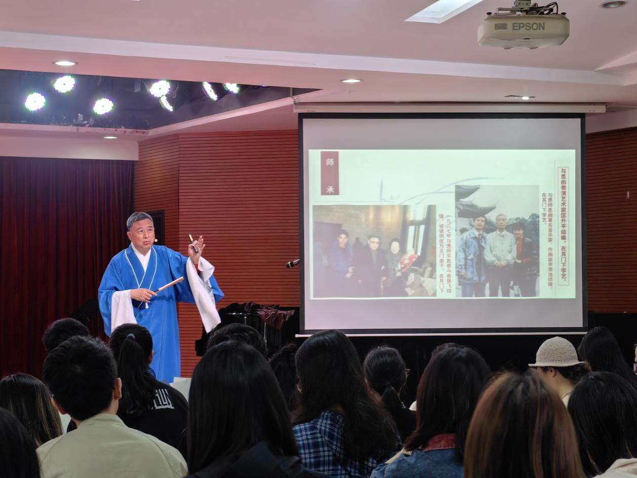 (通訊員:傅子津、馮子萱 攝影:肖依雯、周宇時(shí))2025年4月11日上午10點(diǎn),湖南師范大學(xué)音樂學(xué)院德樂樓411教室內(nèi)座無虛席,一場題為“湖南昆曲藝術(shù)特點(diǎn)”的專題講座在此舉行。活動(dòng)由國家級(jí)非遺傳承人、著名昆曲表演藝術(shù)家張富光先生主講,國家一級(jí)演員劉娜、國家二級(jí)演員鄧建桃、國家二級(jí)演奏員鄢輝亮等昆曲名家聯(lián)袂獻(xiàn)藝,為師生們呈現(xiàn)了一場兼具學(xué)術(shù)性與藝術(shù)性的文化盛宴。